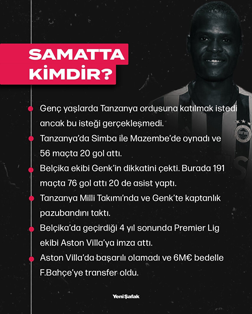 - Samatta bu sezon Fenerbahçe ile 8 karşılaşmada görev yaptı. 27 yaşındaki oyuncu bu karşılaşmalarda 2 gol kaydetti.