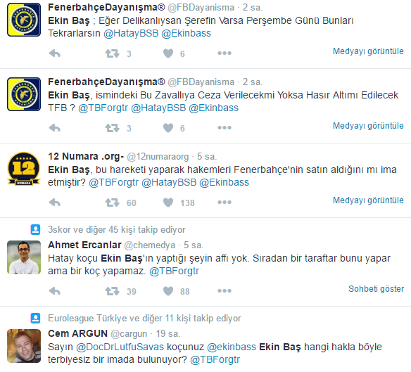 Ekin Baş'ın hakemlere, Fenerbahçe'nin zengin olduğunu ve kendilerinin 'para ile satın alındığı' şeklinde bir imada bulunduğunu belirten taraftarlar bu hareketin cezasız kalmaması gerektiğini belirtiyor.
