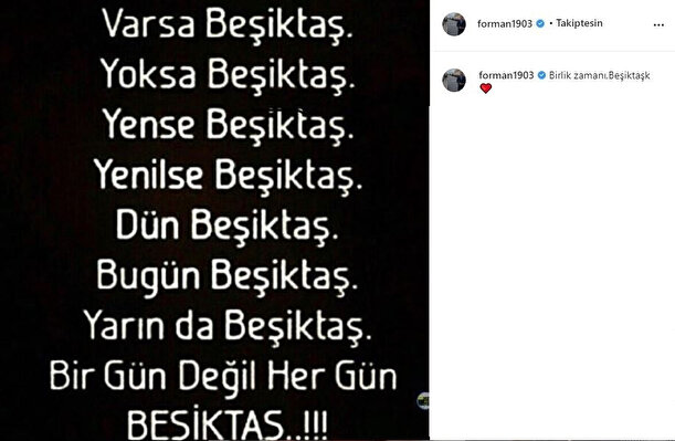 Orman, paylaşımında, "Varsa Beşiktaş, yoksa Beşiktaş. Yense Beşiktaş yenilse Beşiktaş. Dün Beşiktaş bugün Beşiktaş yarın da Beşiktaş. Bir gün değil her gün Beşiktaş!" ifadelerine yer verdi.