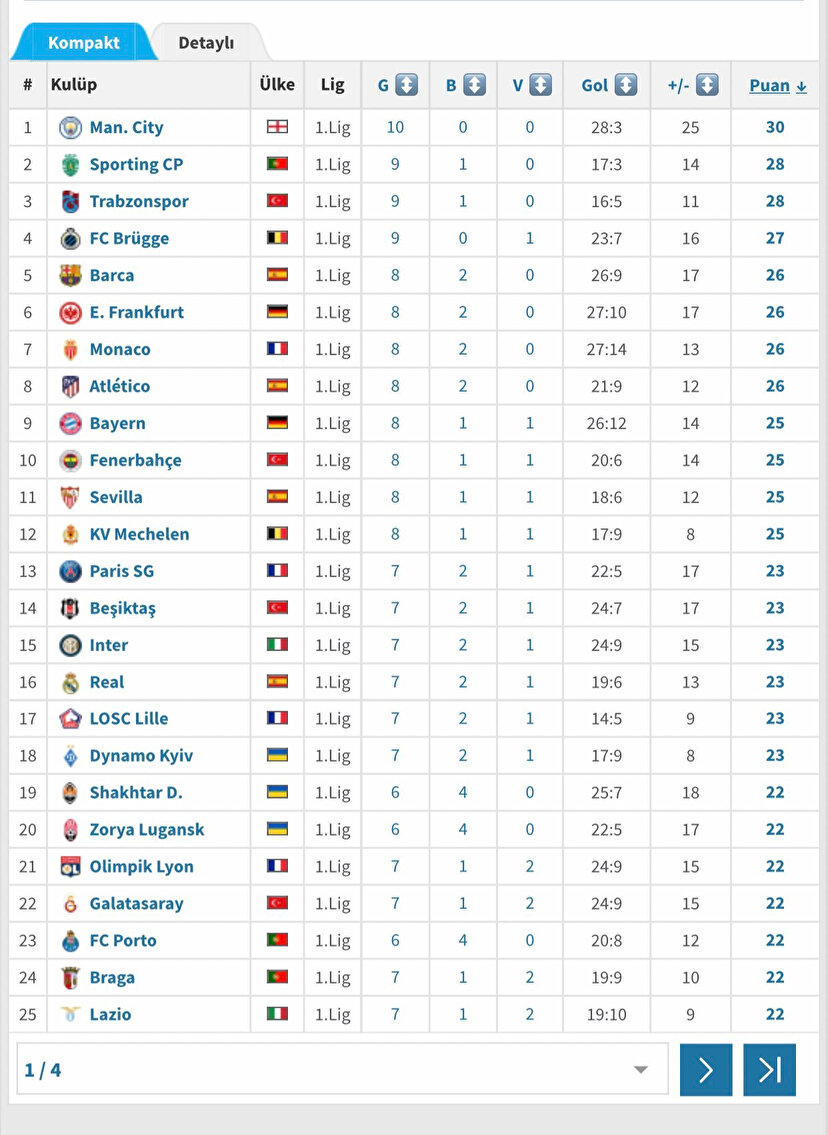 Tabloda ilk sıraya İngiltere Premier Lig lideri Manchester City yerleşti. İngiliz ekibi, 10 maçta 10 galibiyet alarak 30 puan elde etti. 28 gol atıp kalesinde 3 gol gören Avrupa devi, 25 averaja sahip. Trabzonspor ile aynı puana sahip Sporting CP ise 28 puanla 2. sırada. Portekiz kulübü, 10 maçta 9 galibiyet ve 1 beraberlik elde ederken, 17 gol atıp, 3 gol yedi ve 14 averaja sahip oldu. Trabzonspor, 10 maçta 9 galibiyet ve 1 beraberlik elde ederken, bulduğu 16 gole karşılık ise ağlarında 5 gol gördü ve 11 averajla 28 puanla 3. basamakta yer aldı.