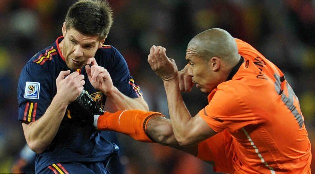 'Futbol Kasabı' lakabını alan Nigel de Jong bu listede kendine yer buldu. Futbolculuk kariyeri haricinde Kick-Box'la da uğraşan De Jong'un İspanyol futbolcu Xabi Alonso'ya maç içinde attığı uçan tekme hala hafızalardan silinmiş değil.