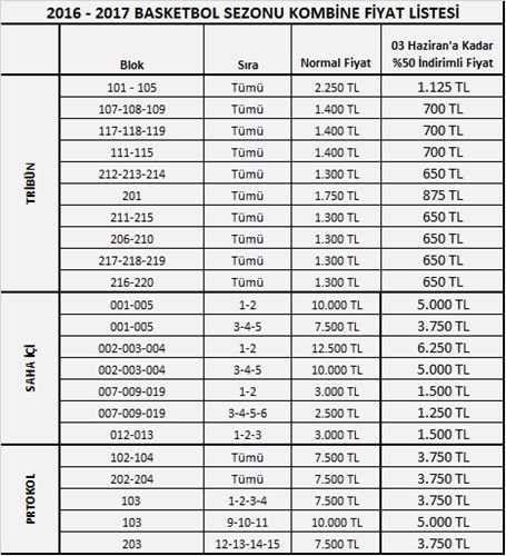 - · 2015-2016 sezonunda geçerli kombine kartı olanlara, yüzde 50 indirimli fiyat üzerinden 15 Mayıs 2016 Çarşamba günü mesai bitimine kadar alım önceliği tanınacak.