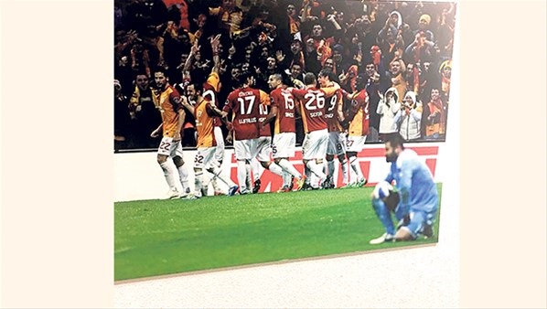 Sarı-kırmızılıların soyunma odasının tam da çıkışında yer alan bir fotoğraf ezeli rakip Fenerbahçe’ye de göndermede bulunuyor. Şampiy10'da yer alan görüntüde Galatasaraylı oyuncuların arka planda sevindiği fotoğrafta yere çökmüş vaziyette Fenerbahçe Kaptanı Volkan Demirel görülüyor.