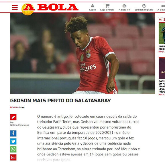 ABOLA'nın iddiasına göre sarı kırmızılı yönetim Gedson Fernandes'i 1.5 yıllığına kiralayacak.