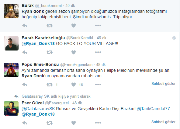 Devre arasında 2.5 Milyon Euro bedelle büyük umutlarla Galatasaray'a gelen Ryan Donk bir türlü bekleneni veremeyince taraftarın hedefi oldu. Dünkü Beşiktaş maçında da tepkiler tavan yaptı.