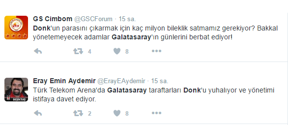 Sarı kırmızılı kulüple 2 yıllık daha sözleşmesi bulunan Donk'un ayrılması için taraftarlar birlik olmuş durumda. Çin'den taliplerinin olabileceğini düşünen Galatasaray taraftarları, Hollandalı oyuncunun ayrılmasını umarak 'İnşallah bize de piyango vurur' diyor.