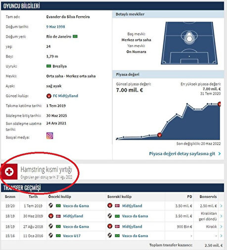 Galatasaray'da 10 numara transferinde en çok istenilen oyunculardan biri olan Evander'in hamstring sakatlık yaşadığı belirtildi. Kısmi yırtık tespit edilen oyuncunun sahalara geri dönüşünün Ağustos ayının sonunu bulabileceği belirtildi.