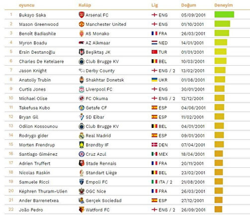 Beşiktaş’ın 20 yaşındaki kalecisi Ersin Destanoğlu, yayımlanan listedeki tek Türk oyuncu oldu. Bu sezon 22’si Süper Lig olmak üzere 24 kez siyah-beyazlıların kalesini koruyan Ersin, bu mücadelelerde 22 gol yedi. Genç yıldız 10 mücadelede de kalesini gole kapadı.
