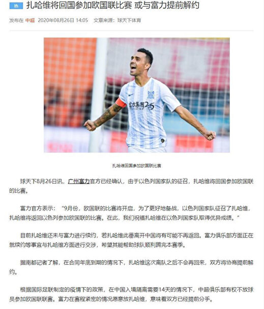 Çin basınında yer alan haberlerde de, Eran Zahavi'nin takımdan ayrılmak istediği kaydedildi. Hatta oyuncunun sosyal medya hesabından yaptığı paylaşım, takımına veda edeceği şeklinde Çin basınında yorumlandı.