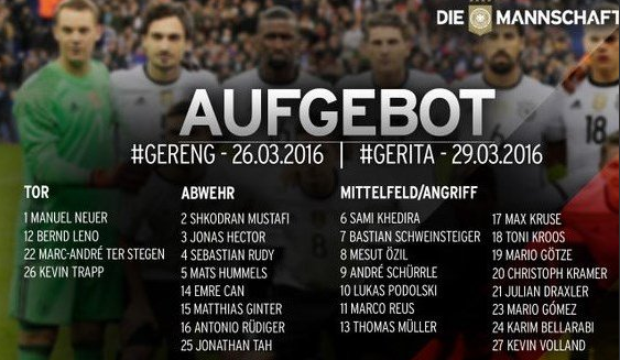 Almanya Futbol Federasyonu , 26 ve 29 Mart tarihlerinde İngiltere ve italya ile oynanacak olan hazırlık maçlarının kamp kadrosunu açıkladı. Kadroda Galatasaraylı Lukas Podolski ve Beşiktaşlı Mario Gomez'de yer aldı.