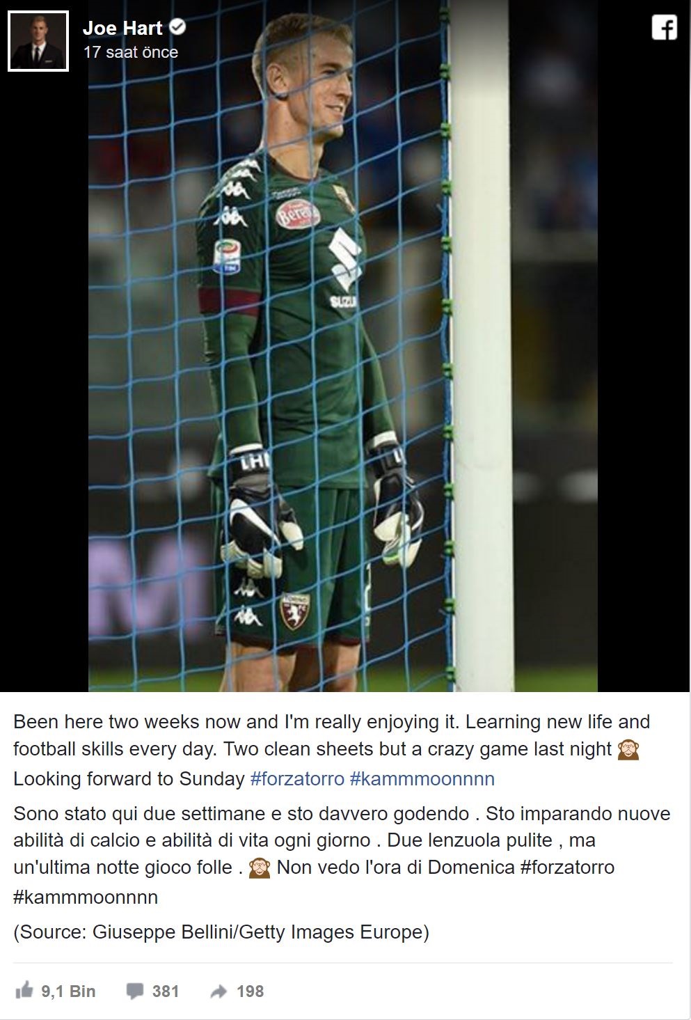 Sezon başı Manchester City'den Torino'ya kiralanan İngiliz eldiven Joe Hart, Facebook'ta paylaştığı bir gönderiyi otomatik olarak İtalyanca'ya çevirince ortaya komik bir tercüme çıktı.