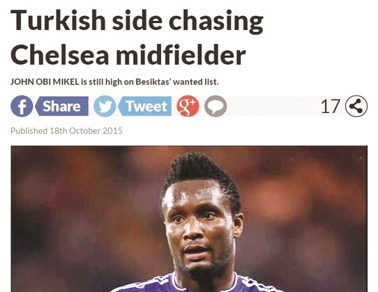 Beşiktaş'ta başkan Fikret Orman, devre arasında takviye yapacaklarını; teknik direktör Şenol Güneş de bir kaleci, bir stoper, bir de orta saha transferi yapacaklarını belirtirken bu konuda İngiliz basınından bir iddia gündeme geldi. Daily Star gazetesi, Beşiktaş'ın devre arasında transfer hedefinin Chelsea'nin orta sahası John Obi Mikel olduğunu iddia etti. Chelsea ile sözleşmesi 2017 sezon sonunda bitecek 28 yaşındaki yıldız için “Sezon öncesinde yapılan teklifler reddedildi. Beşiktaş, devre arasında Chelsea'nin kapısını yeni teklifle çalacak” yorumları yapıldı. Obi Mikel, bu sezon sadece 3 lig maçında 63 dakika süre alabildi.