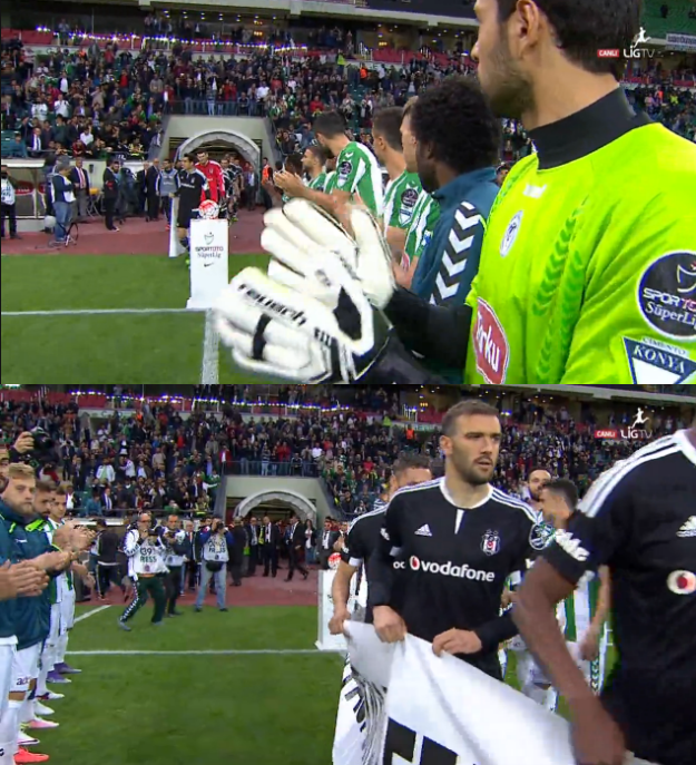 Geçtiğimiz hafta Osmanlıspor'u mağlup ederek şampiyonluğunu ilan eden Beşiktaş, sahaya çıkarken Torku Konyasporlu futbolcular iki sıra halinde sahanın kenarına dizilerek Beşiktaşlı şampiyon futbolcuları alkışladılar.