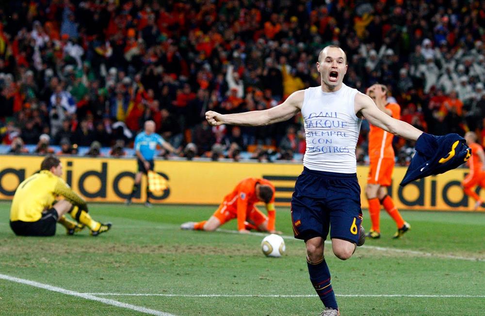 Dünyanın en iyi futbolcuları arasında yer alan orta saha oyuncusu, İspanya'ya 2010 yılında kupayı kazandıran isim olmuştu. 1-0 biten maçta golü atan oyuncu, sevincinde ise formasını çıkartarak henüz 26 yaşındayken kalp krizi geçirerek ölen Espanyol'un eski kaptanı Dani Jarque'ye adamıştı. Iniesta attığı golle tüm İspanyol halkının sevgisini kazanırken sevinciyle de ezeli rakibi Espanyol'un en saygı duyduğu Barcelonalı olmayı başarmıştı.
