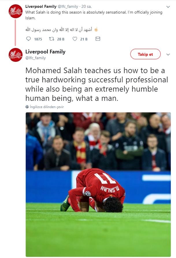 Salah'ın secdede yaşadığı gol sevincinin fotoğrafıyla yapılan paylaşımda, "Salah'ın bu sezon yaptığı şey sansasyonel. Resmen İslam'a geçiyorum. Mohamed Salah alçak gönüllü olmanın yanı sıra bize gerçek anlamda başarılı bir profesyonelin nasıl olacağını öğretiyor" ifadeleri kullanıldı.
