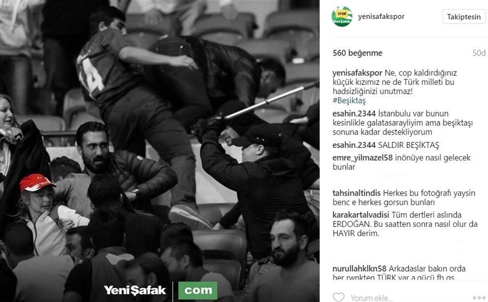 22.05'te başlaması gereken Lyon-Beşiktaş maçı Fransız taraftarların sahaya girmesi sebebiyle saatinde başlayamadı. Fransız holiganlar Türk taraftarlara ellerindeki yabancı maddelerle saldırırken çekilen bir fotoğraf sosyal medyada gündem oldu. O fotoğrafta bir Fransız taraftarının elindeki koltuk değneğini bir kız çocuğuna yönelttiği görüldü.