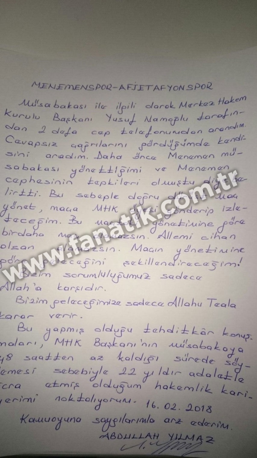 - Menemenspor-Afjet Afyonspor müsabakası ile ilgili olarak MHK Başkanı Yusuf Namoğlu tarafından 2 defa cep telefonundan arandım. Cevapsız çağrılarını gördüğümde kendisini aradım. Daha önce Menemen müsabakası yönettiğimi ve Menemen cephesinin tepkileri olmuştu diye belirtti. Bu sebeple 'Doğru dürüst maç yönet, maça MHK üyesi gönderip izleteceğim. Bu maçtaki yönetimine göre bir daha maç alamazsın. Allemi cihan olsan alamazsın. Maçın yönetimine göre geleceğini şekillendireceğim' ifadelerini kullandı.