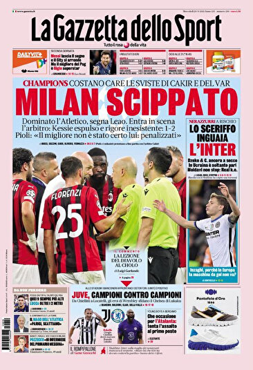Milan'ın Şampiyonlar Ligi'nde Atletico Madrid'e 2-1 yenildiği maçtan sonra İtalyan gazetelerinin manşetlerinde Cüneyt Çakır var. Maça ve skora etki ettiği düşünülen Çakır için 'Şampiyonlar Ligi için yetersiz' değerlendirmeleri yapıldı.