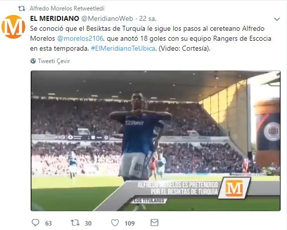 Glasgow Rangers'ın forveti Alfredo Morelos, sosyal medya hesabından dikkat çeken bir harekette bulundu. 21 yaşındaki oyuncu, bir haber sitesinin Beşiktaş'ın Morelos'la ilgilendiğine dair bir paylaşımını retweet etti.