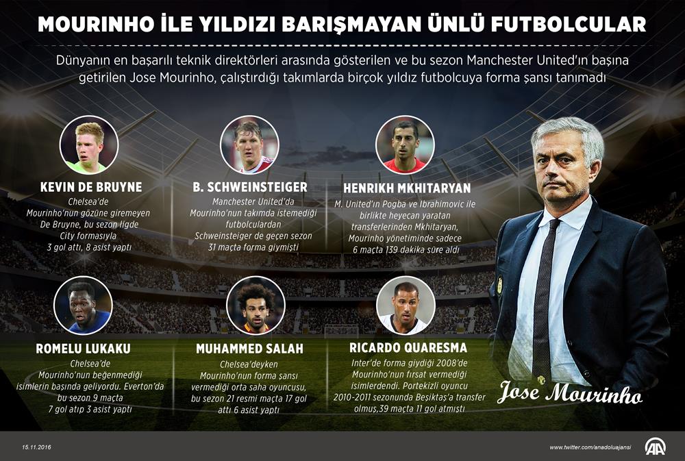 Portekizli teknik adamın Inter, Chelsea ve Manchester United'da arasının iyi olmadığı yıldız futbolcular arasında Kevin De Bruyne, Henrikh Mkhitaryan, Bastian Schweinsteiger, Romelu Lukaku, Juan Mata ve Ricardo Quaresma gibi isimler bulunuyor.