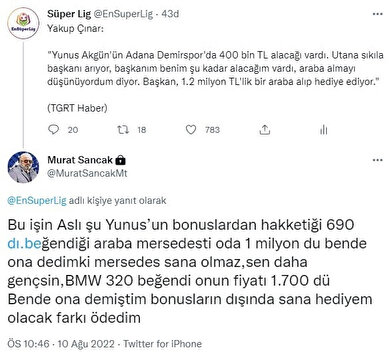Geçtiğimiz sezonu Adana Demirspor'da kiralık olarak geçiren genç oyuncunun 400 bin TL alacağının olduğu ve bu parayı başkan Murat Sancak'tan istediği belirtildi. Sancak, araba almak istediğini söyleyen Yunus Akgün'e 1 milyon 700 bin TL'lik araç hediye ederek unutulmayacak bir jeste imza attı.