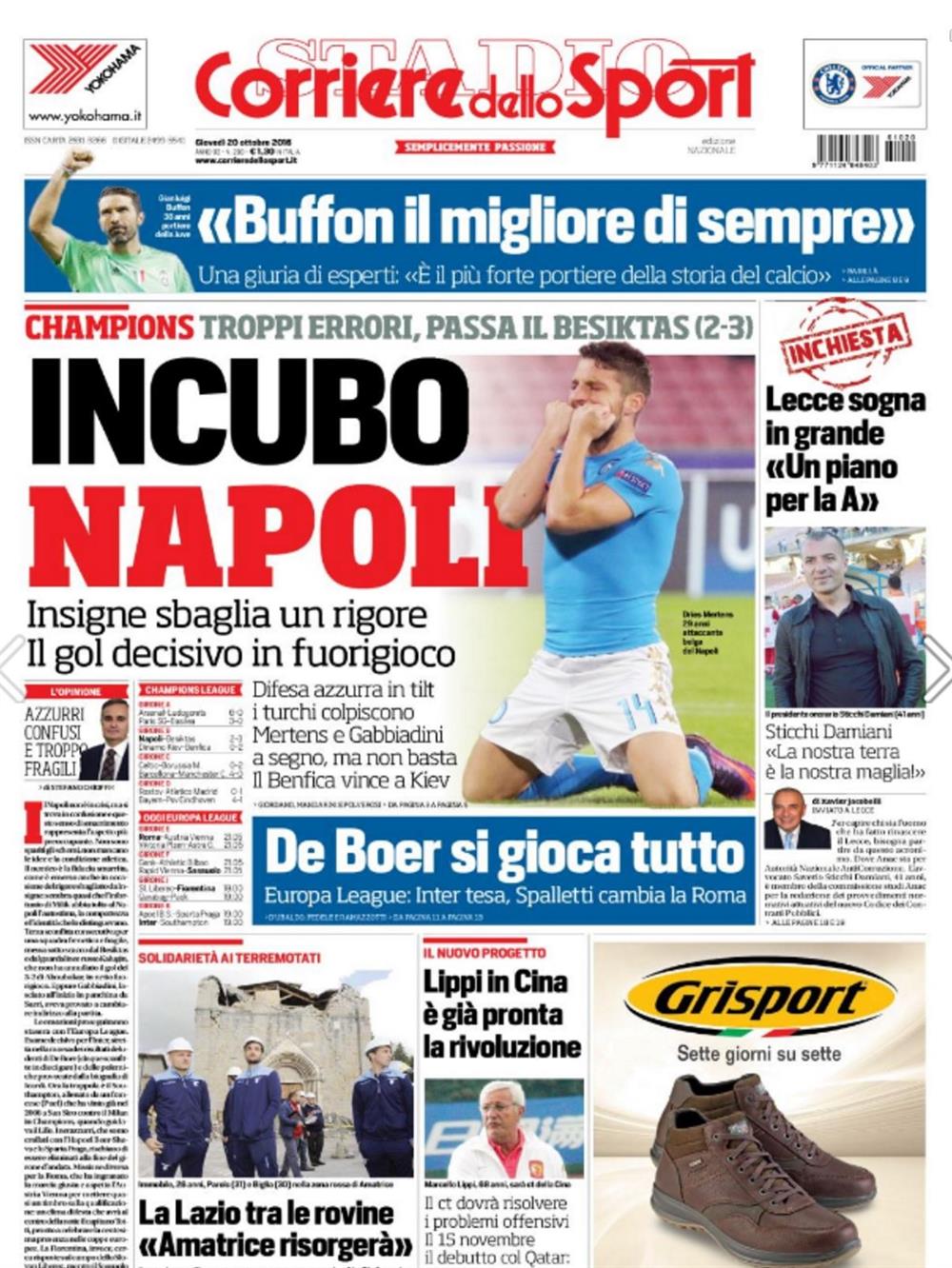 İtalya'nın bir diğer önemli spor gazetesi Corriere dello Sport da "Napoli'de kabus" diye maç haberini sürmanşetten verirken, Lorenzo Insigne'nin penaltıyı kaçırdığı, oyunu belirleyen golün ofsayttan geldiğini savundu.