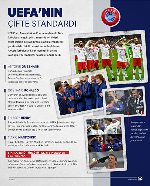 - UEFA, Türk Milli Takımı oyuncularının Arnavutluk ve Fransa maçlarındaki gol sevinçlerinde asker selamı vermesinin ardından, muhtemel siyasi provokasyon iddiasıyla Türkiye Futbol Federasyonu hakkında disiplin soruşturması başlatmıştı.