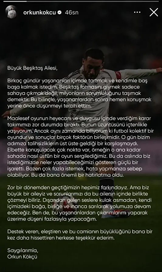Fenerbahçe maçında gördüğü kırmızı kartın ardından yaşanan tartışmalar üzerine Beşiktaş kaptanı Orkun Kökçü, sosyal medya hesabından bir açıklama yaptı.
