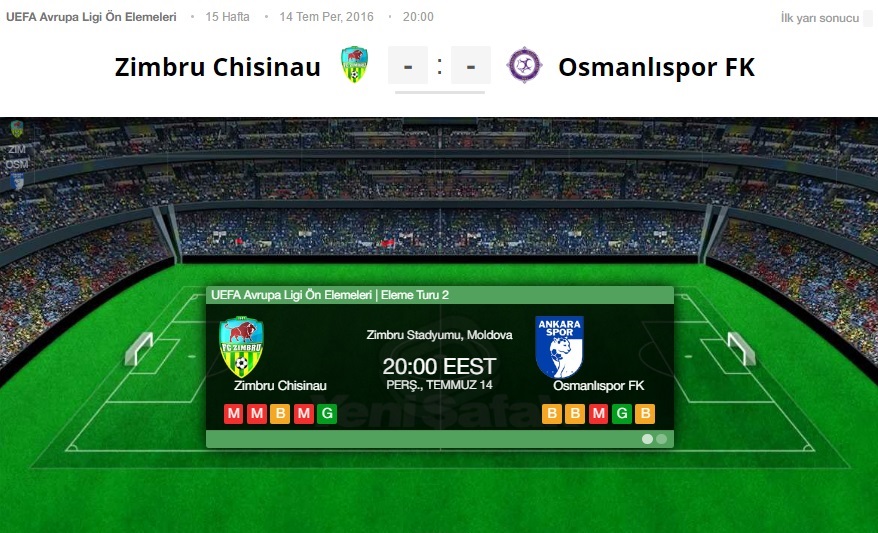 Tarihinde ilk kez Avrupa Kupaları'nda mücadele eden Osmanlıspor, Moldova temsilcisi Zimbru ile karşılaşıyor. Başkent temsilcisi 12.dakikada Numan Çürüksu'nun attığı rövaşata golüyle 1-0 öne geçti. Bu gol Osmanlıspor'un Avrupa Kupaları tarihinde attığı ilk gol oldu.