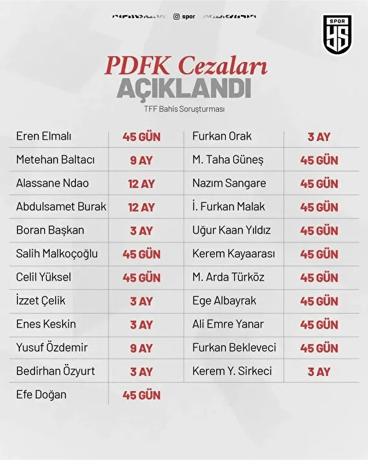 PFDK bahis oynayan futbolcuların cezasını açıkladı. Eren Elmalı’ya 45 gün, Metehan Baltacı’ya 9 ay hak mahrumiyeti cezası verildi.