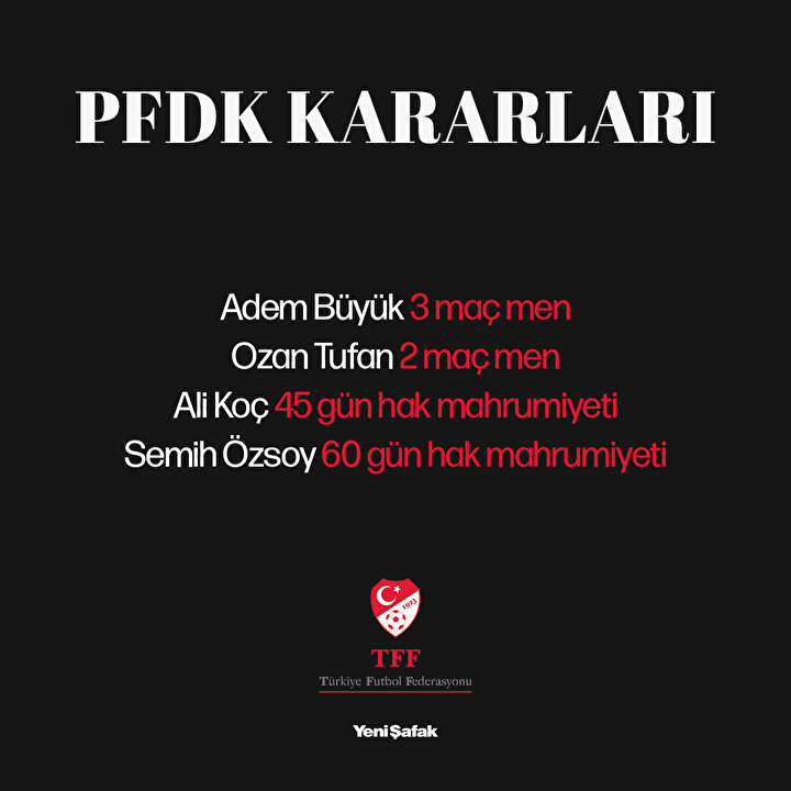 Profesyonel Futbol Disiplin Kurulu kulüplere verilen cezaları açıkladı. Fenerbahçe Başkanı Ali Koç, sportmenliğe aykırı açıklamalarda bulunulmasından dolayı 45 gün hak mahrumiyeti ve 30.000 TL para cezası alırken Galatasaray'dan Adem Büyük 3 maç, Fenerbahçe'den Ozan Tufan ise 2 maç men cezası aldı. Fenerbahçe Başkan Vekili Semih Özsoy ise 60 gün hak mahrumiyeti aldı.