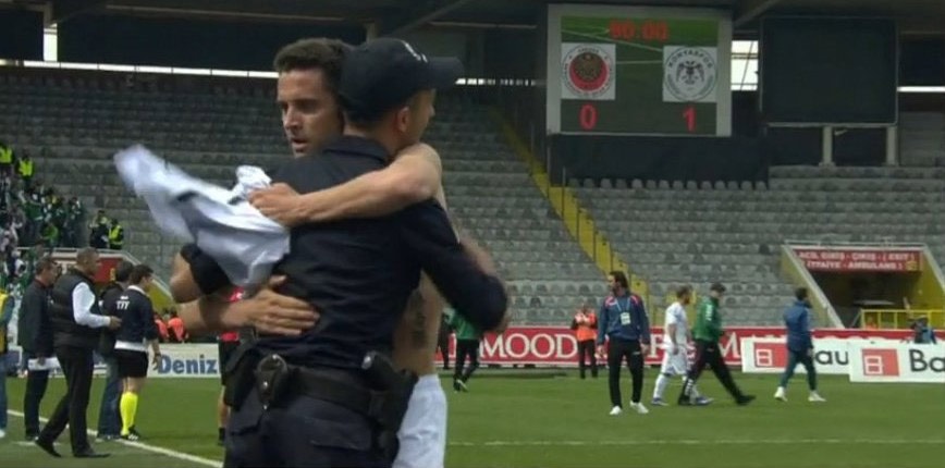 Rangelov, attığı golün ardından görevli olan polise ''sizin yanınızdayız'' diyerek önce sarıldı sonra formasını vardı.