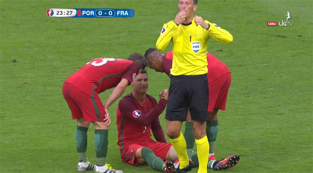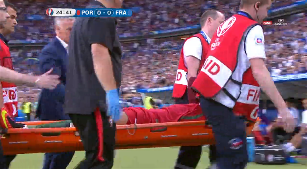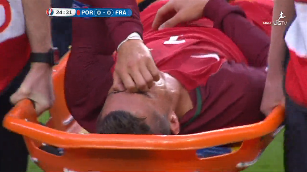 EURO 2016 finalinde Fransa ile karşılaşan Portekiz'de Cristiano Ronaldo şoku yaşandı. Portekizli futbolcu 17. dakikada sakatlanınca göz yaşlarına hakim olamadı. Tedavisinin ardından sahaya geri dönen yıldız futbolcu oyuna devam edemeyeceğini anlayınca 25. dakikada sedyeyle oyundan çıkarken yerine Quaresma girdi.
