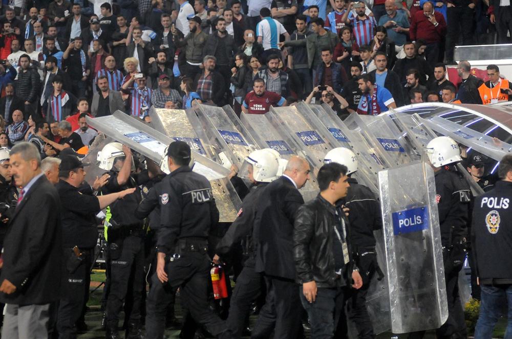Süper Ligi'nin 30. haftasında Trabzonspor ile Fenerbahçe arasında oynanan maçın tatil edilmesinin ardından saldırıya uğrayan karşılaşmanın çizgi hakemi Volkan Bayarslan, ifadesi alınmak üzere polis aracına bindirilerek karakola götürüldü.