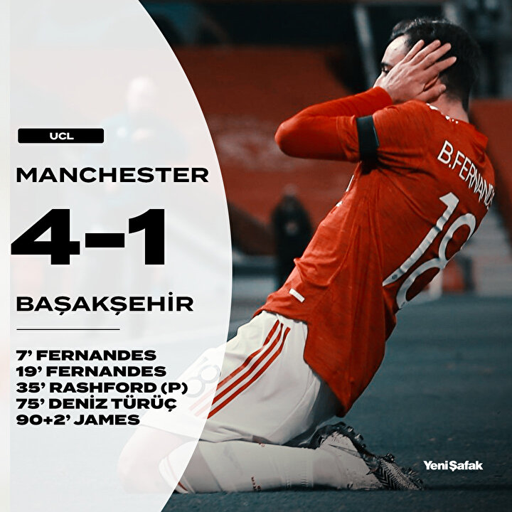 UEFA Şampiyonlar Ligi H Grubu 4'üncü maçında İstanbul Başakşehir, deplasmanda İngiltere temsilcisi Manchester United'a 4-1 mağlup oldu. Manchester United'a galibiyeti getiren golleri 7 ve 19'uncu dakikalarda Bruno Fernandes, 35'inci dakikada penaltıdan Marcus Rashford ve 90 2'nci dakikada Daniel James kaydetti. İstanbul Başakşehir'in tek golü ise 75'inci dakikada Deniz Türüç'ten geldi.