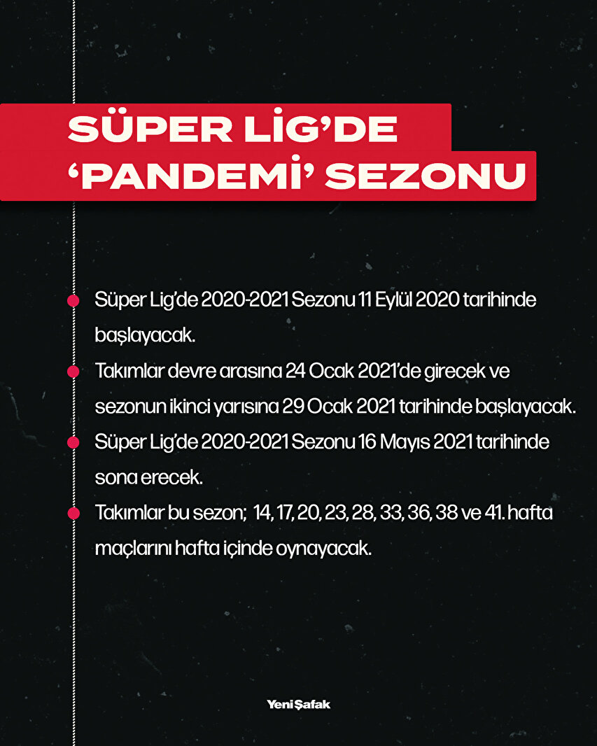 11 Eylül'de başlayacak olan Süper Lig'de ilk devre, 24 Ocak 2021'de sona erecek. İkinci devre maçları 29 Ocak 2021'de tekrar start alacakken, sezon ise 16 Mayıs 2021'de tamamlanacak. Süper Lig'de 14, 17, 20, 23, 28, 33, 36, 38 ve 41'inci hafta maçları ise hafta içinde oynanacak.