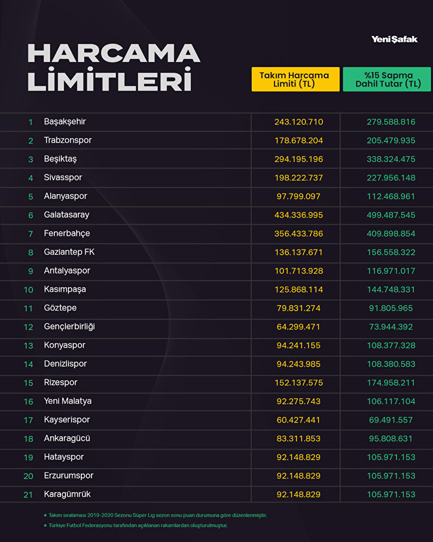 İşte Süper Lig ekiplerinin harcama limitleri;