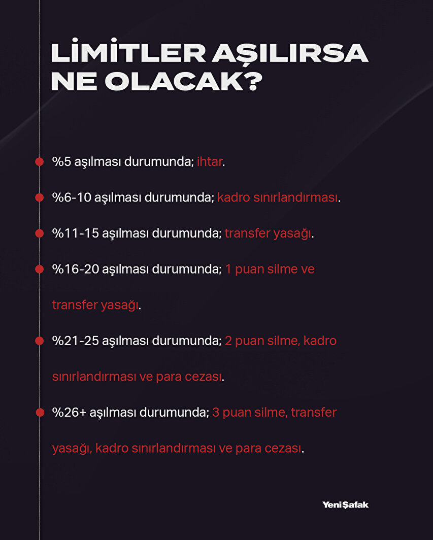 - Yüzde 26 ve üstü aşılırsa: 3 puan silme cezası, buna ek olarak transfer yasağı, kadro sınırlaması ve para cezası yaptırımlarından biri veya birkaçının uygulanması.
