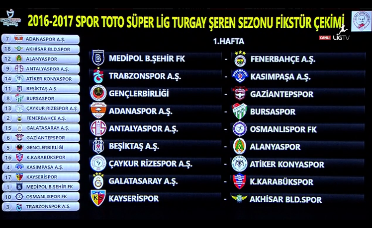 Spor Toto Süper Lig'de 2016 - 2017 Turgay Şeren Sezonu fikstürü belli oldu. TFF'nin Riva'daki tesislerinde çekilen kura sonucu ilk derbi 5. haftada Beşiktaş - Galatasaray arasında, son derbiyse 33. haftada Fenerbahçe - Trabzonspor arasında oynanacak.