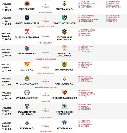 Süper Lig'de 7, 8 ve 9 Temmuz'da oynanacak maçların hakemleri duyuruldu. Türkiye Futbol Federasyonu Merkez Hakem Kurulundan yapılan açıklamaya göre maçları yönetecek hakemler şunlar: