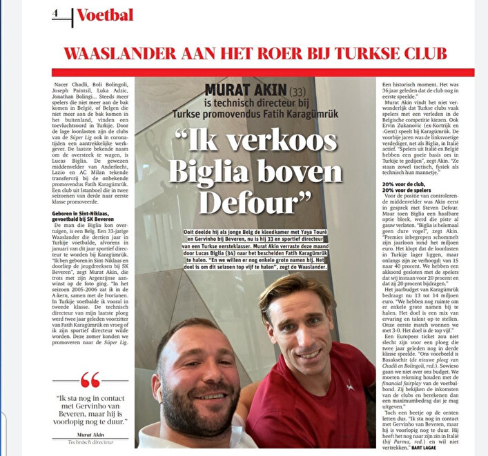 Karagümrük Sportif Direktörü Murat Akın, Avrupa basınından Voetbal'a özel bir röportaj verdi. Akın, hedeflerinin Süper Lig'de ilk 5'te yer almak olduğunu söyledi. Murat Akın, Belçika ve İtalya'daki futbolcuların Türkiye liginde başarılı olacak altyapıya sahip olduğunu belirtirken Biglia'nın okula giden çocukları için Avrupa'da kalmaktan yana tavır koyduğunu ve Independiente'nin teklifini geri çevirdiğini açıkladı. Akın, Steven Defour'u istediğini ancak Biglia'nın boşa çıkmasının ardından Arjantinli oyuncuya teklif götürdüklerini ifade etti.