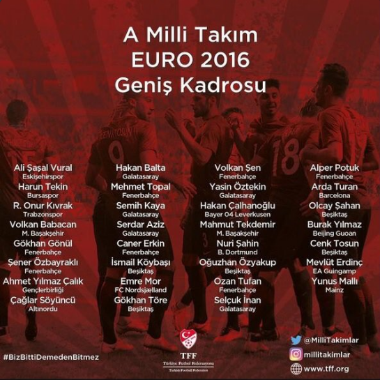 Gökhan Gönül, Şener Özbayraklı, Semih Kaya, Serdar Aziz, Çağlar Söyüncü, Ahmet Çalık, Caner Erkin, İsmail Köybaşı, Hakan Balta, Mehmet Topal, Selçuk İnan, Ozan Tufan, Oğuzhan Özyakup, Hakan Çalhanoğlu, Nuri Şahin, Mahmut Tekdemir, Arda Turan, Olcay Şahan, Alper Potuk, Volkan Şen, Yasin Öztekin, Emre Mor, Gökhan Töre, Burak Yılmaz, Cenk Tosun, Yunus Mallı, Mevlüt Erdinç