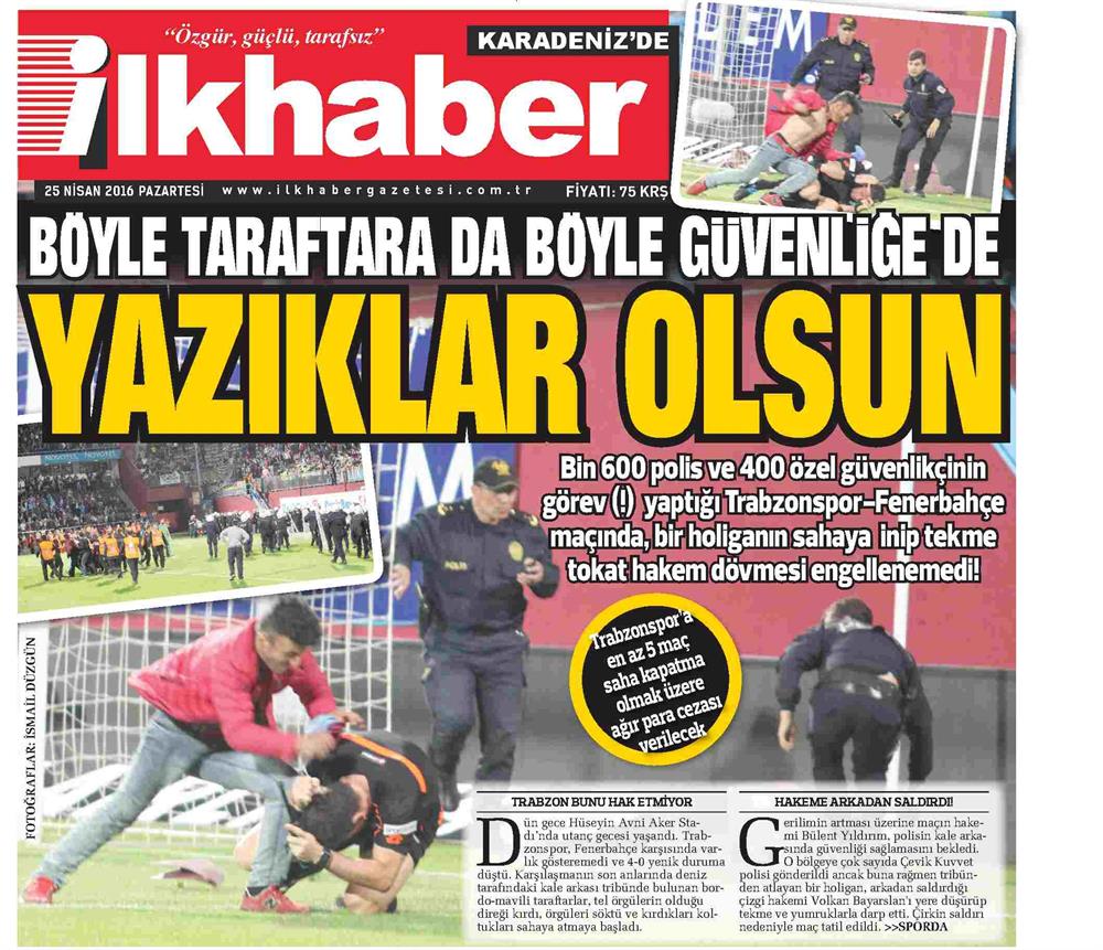 Karadeniz'de İlk Haber Gazetesi, 'Böyle taraftara da böyle güvenliğe de yazıklar olsun' manşetini attığı haberde, toplam iki bin güvenlik görevlisinin olduğu karşılaşmada sahaya giren taraftarın hakeme saldırmasına tepki gösterdi.