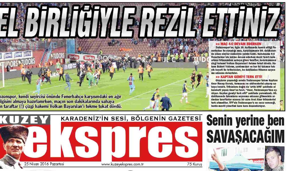 Kuzey Ekspres Gazetesi, 'El birliğiyle rezil ettiniz' manşetini attığı haberde, bordo mavili takımın tarihinin en ağır yenilgisini almak üzere olduğu dakikalarda sahaya atlayan taraftarın hakeme saldırdığını sayfalarına taşıdı.