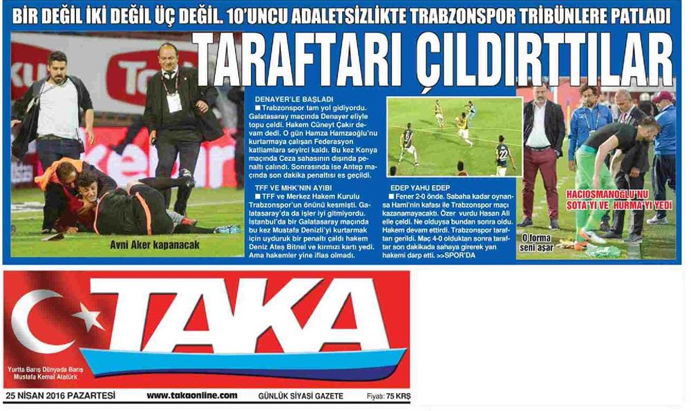 Taka Gazetesi, 'Taraftarı çıldırttılar' manşetiyle duyurduğu haberde, 'bir değil iki değil üç değil onuncu adaletsizlikte Trabzonspor tribünleri patladı' ifadelerini kullandı. Gazete ayrıca, kaleci Onur'un formasını yere bırakmasıyla ilgili olarak 'o forma seni aşar' dedi.
