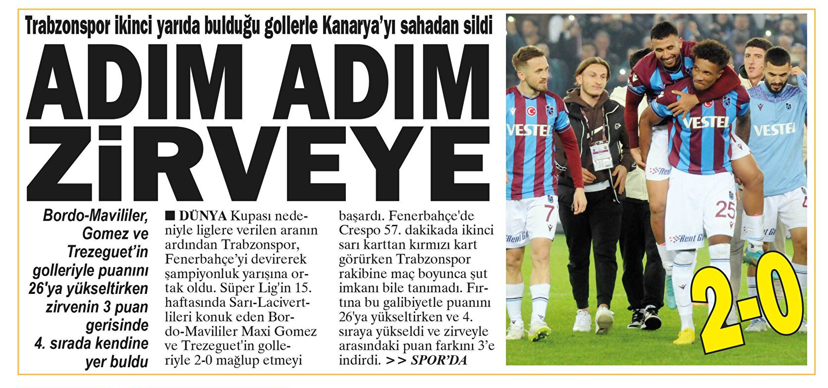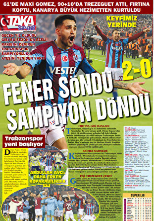 Taka gazetesi ilk sayfasında "Alnınızdan öpüldünüz", "Dünya Kupası arası Trabzonspor'a yaradı, 41 bin taraftar Akyazı'yı inletti, Fener'i puansız gönderdi" başlıklarına yer verirken, son sayfasında ise futbolcuların sevinç fotoğrafları ile "Fener söndü şampiyon döndü" ifadelerini kullandı.