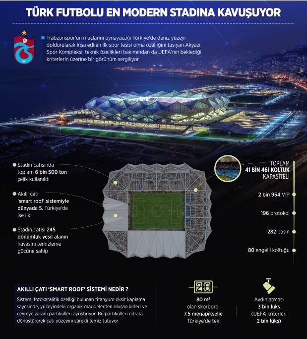 Dolgu işlemlerine 2011, inşaatına ise 2013 yılında başlanan Trabzonspor'un yeni stadı Akyazı'nın resmi açılışı, bugün yapılacak etkinliklerle gerçekleştirilecek. Cumhurbaşkanı Recep Tayyip Erdoğan, Katar Emiri Şeyh Temim Bin Hamad Al Sani, Başbakan Binali Yıldırım, siyasiler, Trabzonspor'da görev yapan eski başkanlar, yöneticiler, futbolcular, teknik direktörler, birçok konuk ve davetlinin yanı sıra taraftarların da yer alacağı açılış etkinliği 18.30'dan itibaren gerçekleştirilecek. Saat 17.30'da Avni Aker Stadı'ndan kortej yürüyüşü ile başlayacak açılış programı, kortejin Akyazı Stadı'na girişi ile devam edecek. Stattaki programda 3D animasyon gösterileri, koreografiler, protokol konuşmaları, gösteri maçı ve Mazlum Kiper'in anlatımıyla bordo-mavili kulübün 50 yıllık tarihinden daha önce yayınlanmamış özel görüntüleri içeren bir video mapping etkinliği yer alacak. Açılış etkinliği tüm taraftarlara ücretsiz olacak, stada ulaşımın sağlanması için birçok noktadan da otobüsler kaldırılacak. Açılış töreninde uzun süren görüşmeler neticesinde anlaşma sağlanan isim hakkı sponsorluğunun açıklanacağı, ayrıca Akyazı Spor Kompleksi'ne de verilecek adın bugün resmen duyurulacağı bildirildi.
