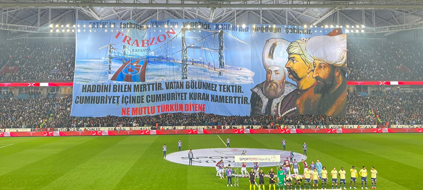 Süper Lig'in 15. haftasında Trabzonspor, Fenerbahçe'yi konuk etti. Stadın hemen hemen tamamının dolu olduğu derbide, tribünlerden maç önü koreografisi geldi. Koreografide "Cumhuriyet" göndermesi yapıldı. Detaylara haberimizin içerisinden ulaşabilirsiniz.