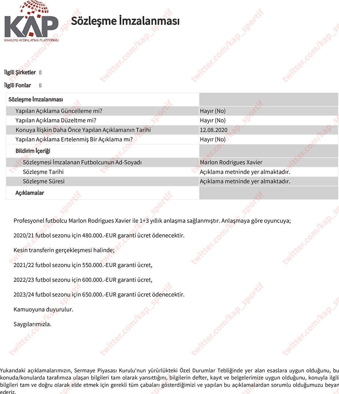 "Profesyonel futbolcu Marlon Rodrigues Xavier'in, 2.000.000.-EUR satın alma opsiyon hakkı kulübümüze ait olmak üzere 1(Bir) yıl süreyle geçici transferi konusunda, Fluminense Kulübü ile anlaşma sağlanmıştır. Anlaşmaya göre, Fluminense Kulübüne kiralama bedeli olarak, 150.000.-EUR ödenecektir. Satın alma opsiyonunun kullanılması ve futbolcunun başka bir kulübe kesin transferi/kiralanması halinde, Fluminense Kulübüne, kesin transfer/kiralama tutarının %10'u kadar satış payı ödenecektir."