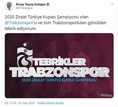 - Cumhurbaşkanı Recep Tayyip Erdoğan, Ziraat Türkiye Kupası Finali’nde Alanyaspor’u 2-0 yenerek kupaya uzanan Trabzonspor’u tebrik etti. Cumhurbaşkanı Erdoğan, sosyal medya hesabından yaptığı paylaşımda, “2020 Ziraat Türkiye Kupası şampiyonu olan Trabzonspor’u ve tüm Trabzonsporluları gönülden tebrik ediyorum” ifadelerini kullandı.